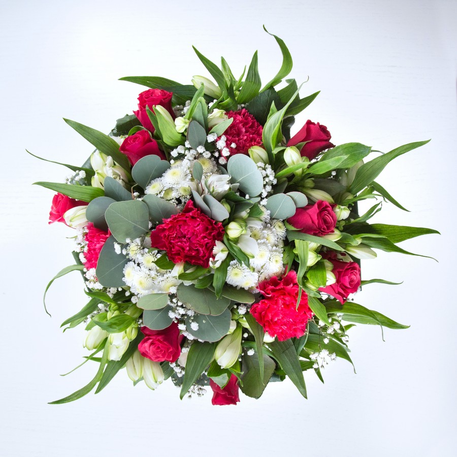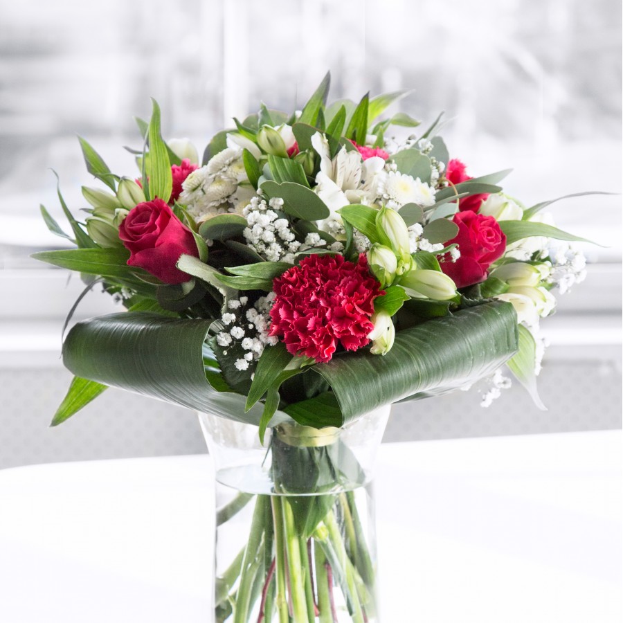 Transform any space with our Elegant Blossom Bouquet, a symbol of refined beauty. This arrangement showcases red roses and carnations paired with sweet white chrysanthemums and gypsophila, all meticulously arranged with white alstroemeria and aspidistra leaves for a graceful presentation.