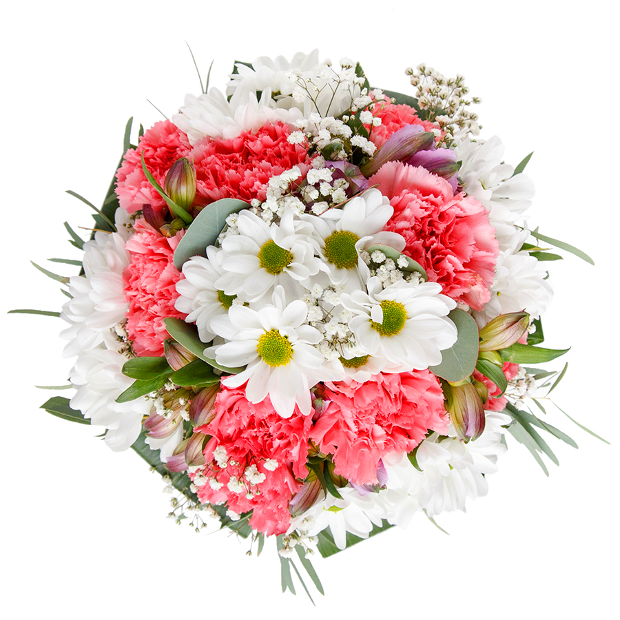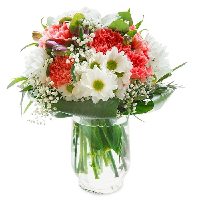 Delight someone special with our radiant seasonal bouquet, meticulously crafted to combine elegance with natural splendor. Adorned with pristine white chrysanthemums, airy strands of gypsophila, graceful light pink carnations, and the complementing aspidistra leaves, this bouquet offers an exquisite visual experience.